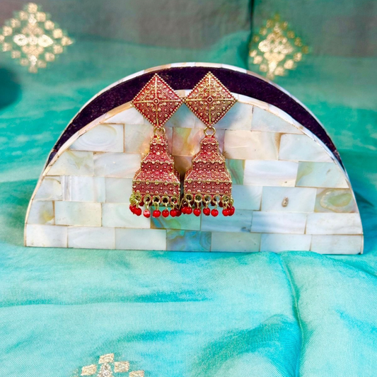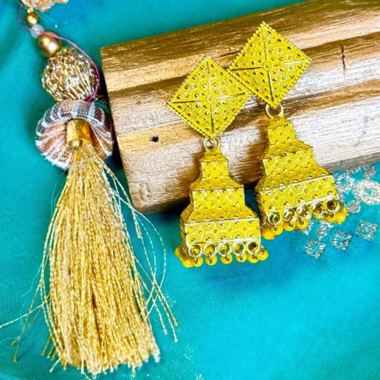 - The golden earrings can be worn with conventional sarees or lehengas.