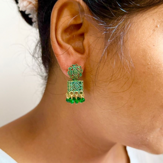 Golden Grace Elephant & Peacock Dual Oxidised Jhumka Earrings