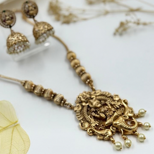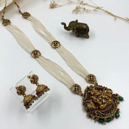 Pearl Majesty Temple Set – Antique Gold Necklace with Goddess Pendant & Stud Jhumkas