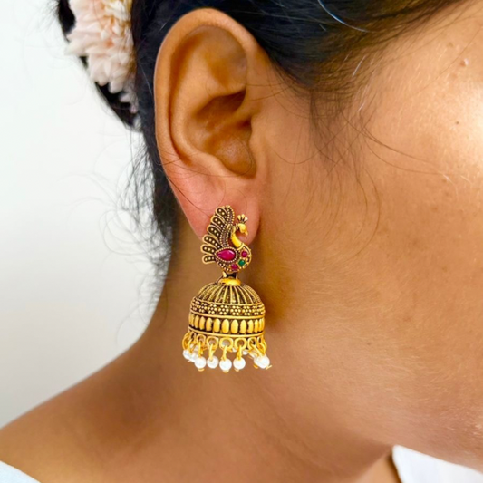 Regal Golden Parrot Jhumka Earrings with Pearl Drops