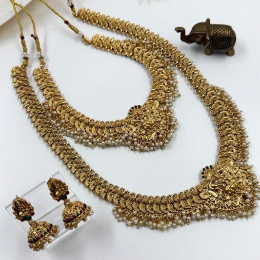 Lakshmi Double Layer Temple Necklace Set with Jhumkas – Antique Gold Finish & Pearl Detailing