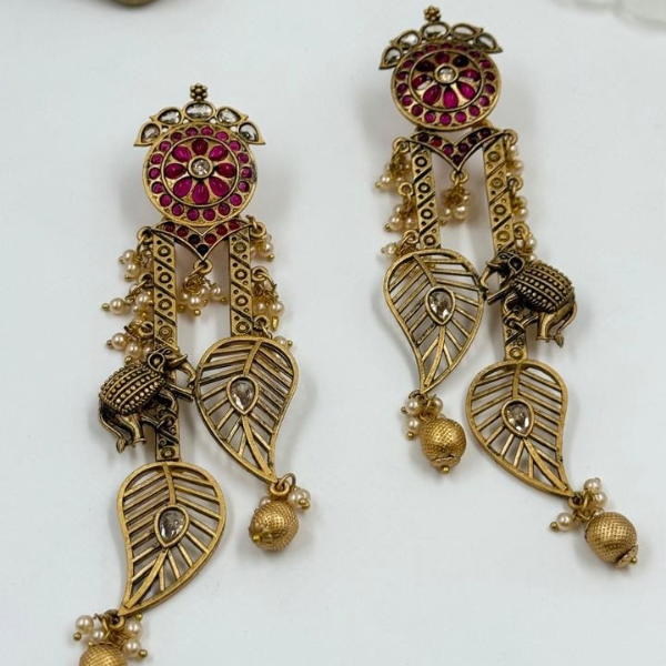 Royal Charm Antique Gold Long Earrings with Elephant & Leaf Design