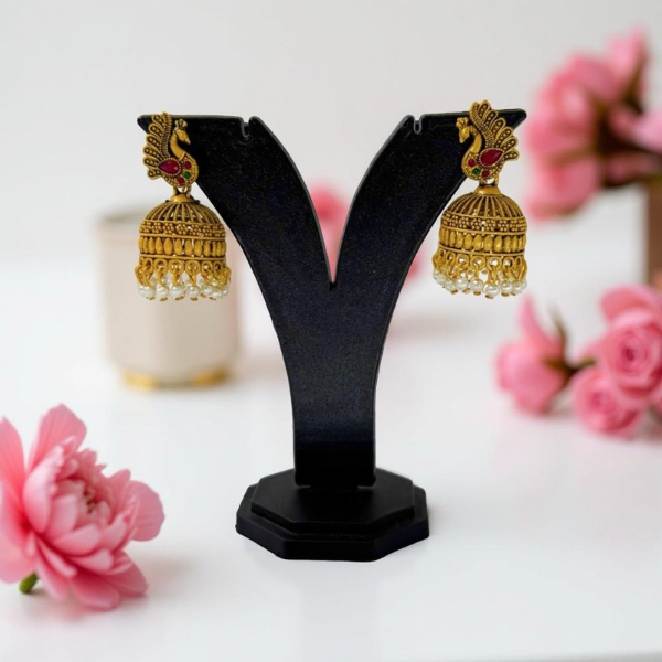 Let your ears do the talking with these exquisite Royal Ruby Peacock Jhumkas! Crafted in gold-tone metal, these stunning earrings feature an intricately detailed peacock design adorned with ruby-red accents and pearl danglers for a regal charm. Whether you’re dressing up for a wedding, festive occasion, or a grand celebration, these earrings are designed to make you shine like royalty. Their traditional-meets-modern aesthetic makes them a must-have for every jewelry lover. Flaunt your elegance and let the peacock magic take flight!