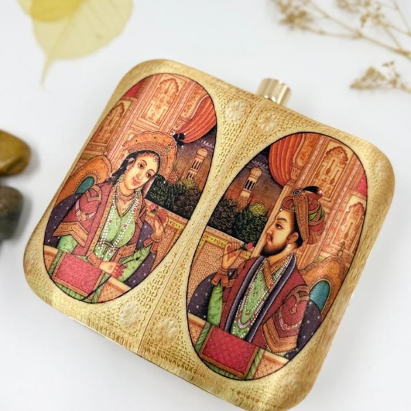 The Raja Rani Printed Clutch is a majestic and romantic accessory that celebrates the timeless elegance of Indian royalty. Featuring a stunning print of a regal couple, the Raja and Rani, this clutch exudes a sense of luxury, grandeur, and love. With its intricate design, vibrant colors, and nostalgic charm, the Raja Rani Printed Clutch is a beautiful tribute to India's rich cultural heritage, making it a perfect accessory for anyone who appreciates history, romance, and traditional Indian art.